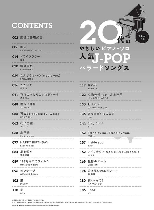 J-POP Ballad Songs Collection for Twenties Piano Solo(Beginner) Sheet Music Book
