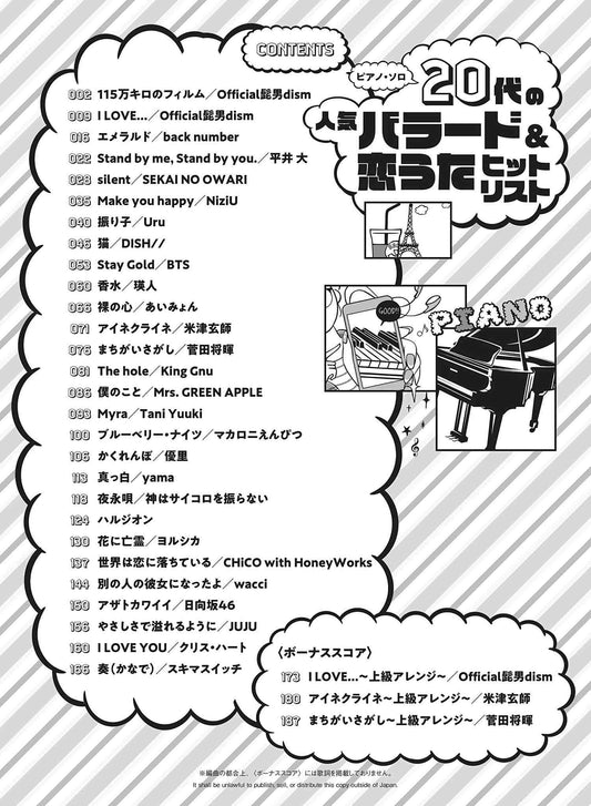 Für Zwanziger: Neues Notenbuch für die besten J-POP-Hits für Klavier Solo (obere Mittelstufe).