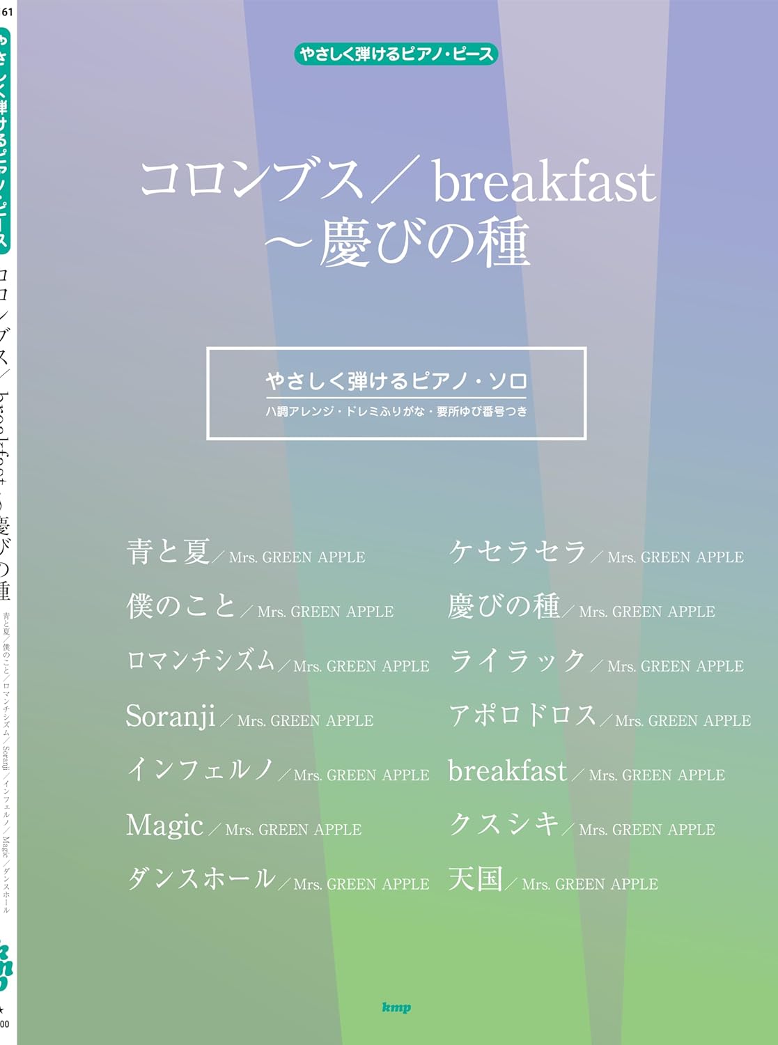 Mrs. GREEN APPLE: Columbus / Breakfast ~ Seeds of Joy - Piano Solo (Easy) - Sheet Music Book